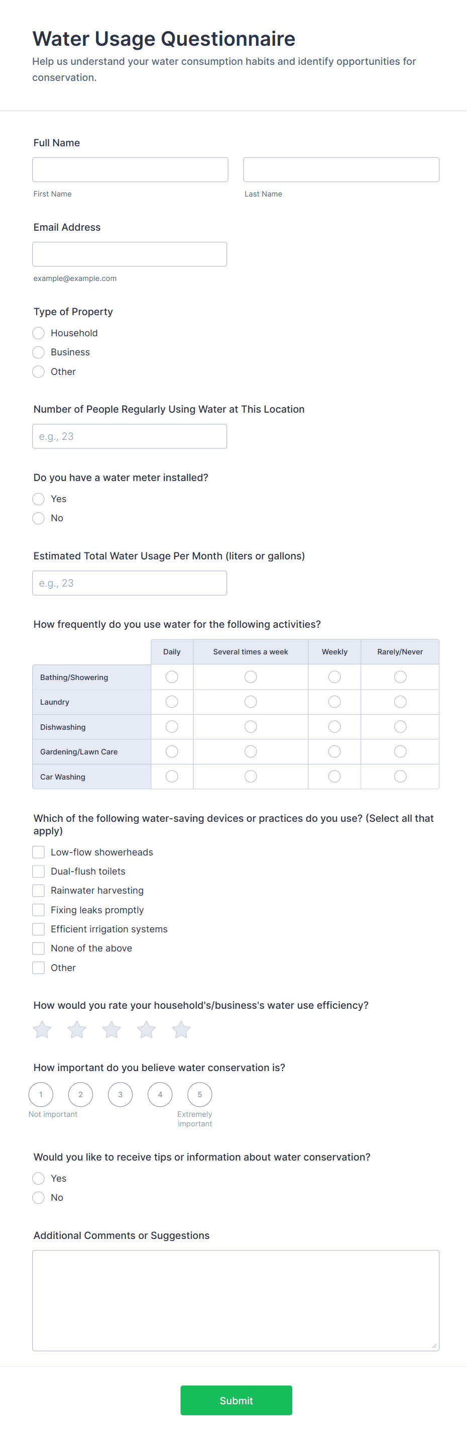 - Content and fields differ based on the objective: e.g., a health screening questionnaire may include medical history and symptom checklists, while a customer feedback form focuses on satisfaction ratings and open-ended comments.