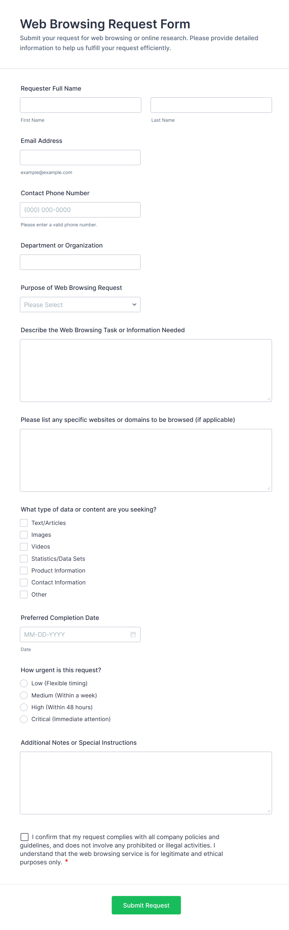 Common fields include requester’s name, contact details, department, type of request, detailed description, urgency, and any relevant attachments.