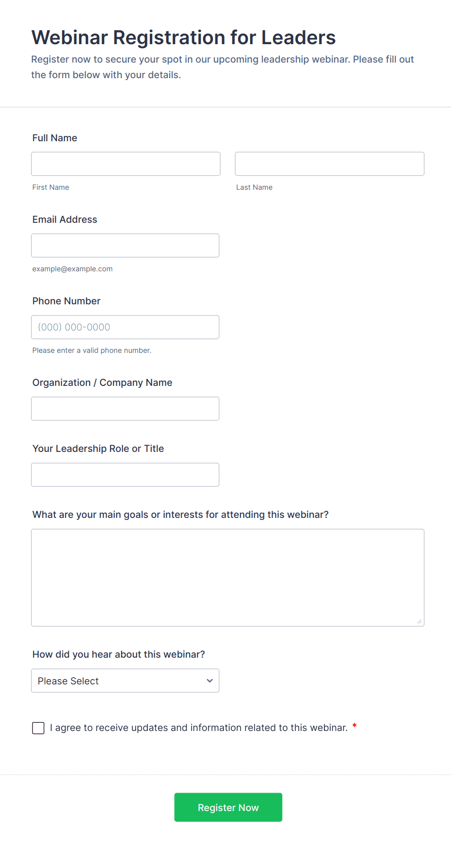 - Session or workshop selection (dropdowns or checkboxes)