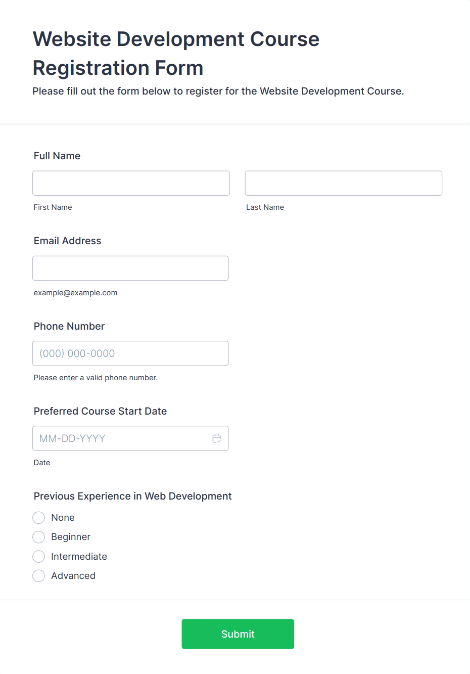 • Corporate Training: Collect employee ID, department, and supervisor approval.