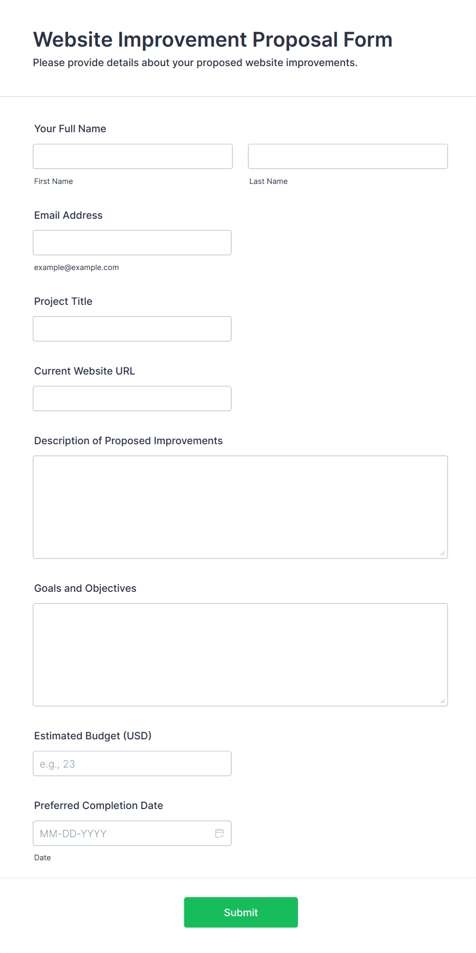 A web design form is an online form used by web designers and agencies to collect information from clients, manage project requests, gather feedback, or handle support inquiries related to website projects.