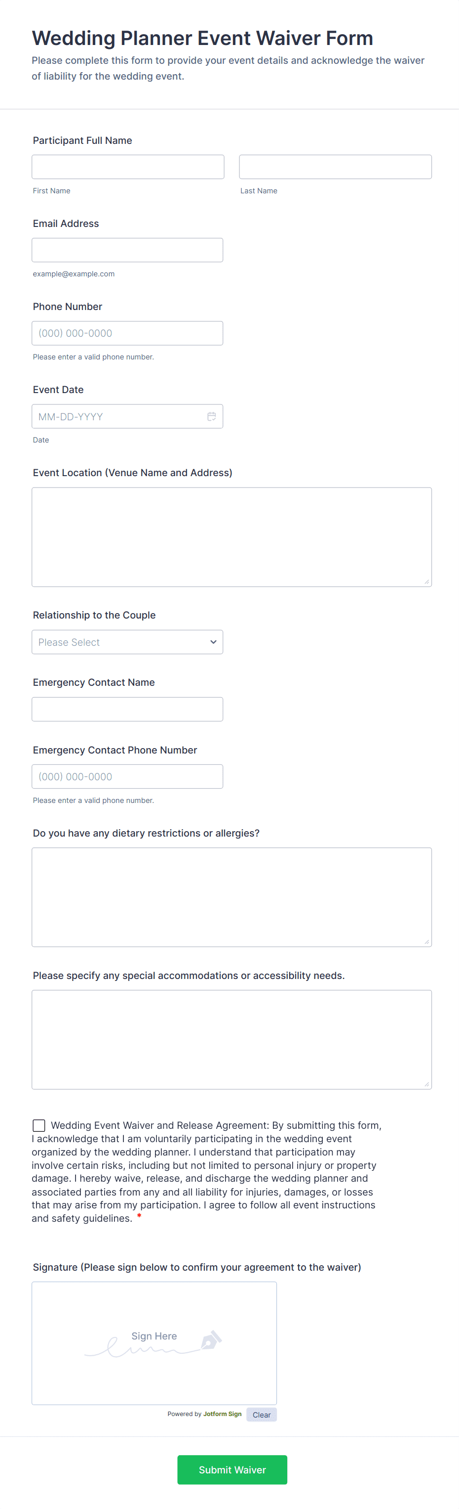 • Content and fields vary by use case: A gym waiver may require health disclosures, while a school field trip waiver may need emergency contact information.