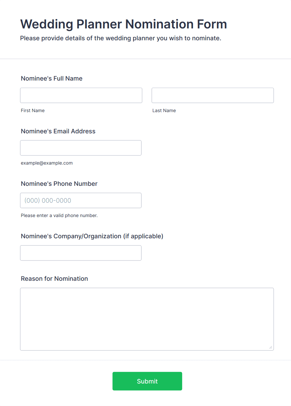 Wedding Forms are specialized digital forms designed to streamline and organize every aspect of wedding planning and management. These forms can be used for a variety of purposes, such as collecting RSVPs, managing guest lists, coordinating vendors, tracking budgets, gathering song requests, and even collecting feedback after the event. Whether you’re a couple planning your own wedding, a professional wedding planner, or a venue coordinator, Wedding Forms help ensure that all details are captured efficiently, reducing the risk of miscommunication and last-minute surprises. Their versatility makes them suitable for both intimate gatherings and large-scale celebrations, covering everything from pre-wedding preparations to post-event follow-ups.
