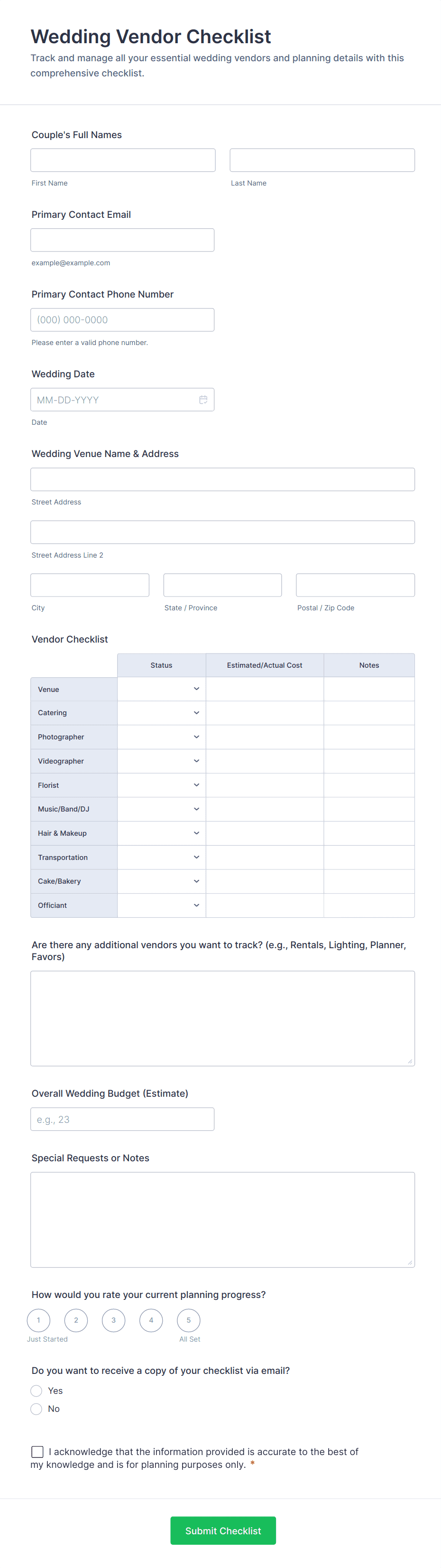 - Configure autoresponder emails to confirm submissions and send notifications to relevant parties (e.g., vendors, planners, or the couple).