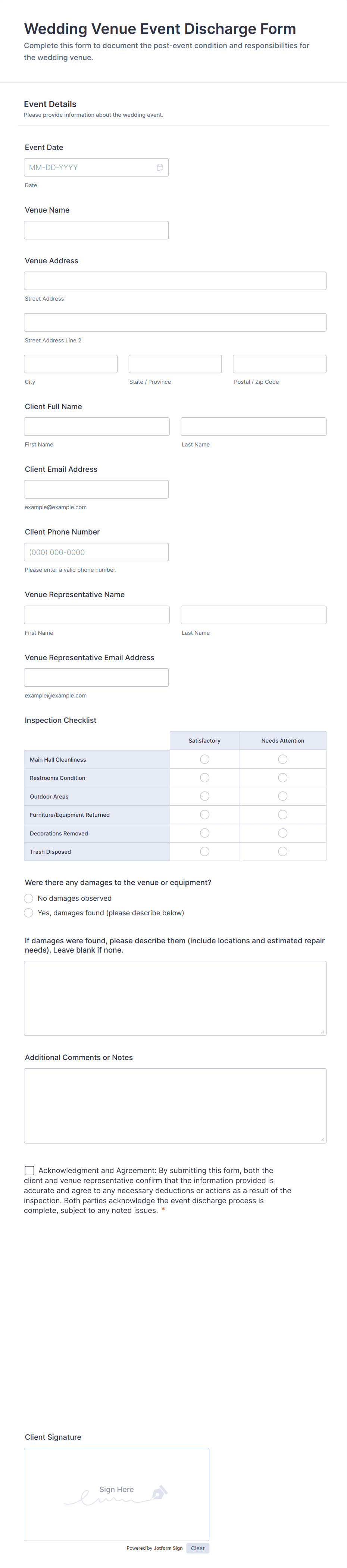 The form templates here are for informational purposes only. Jotform is not providing legal, financial, or other advice, or implying that the forms are legally valid in all or any jurisdictions. Before using any such form, consult an attorney and/or other applicable professionals to make sure that the form meets your needs, legally and otherwise.