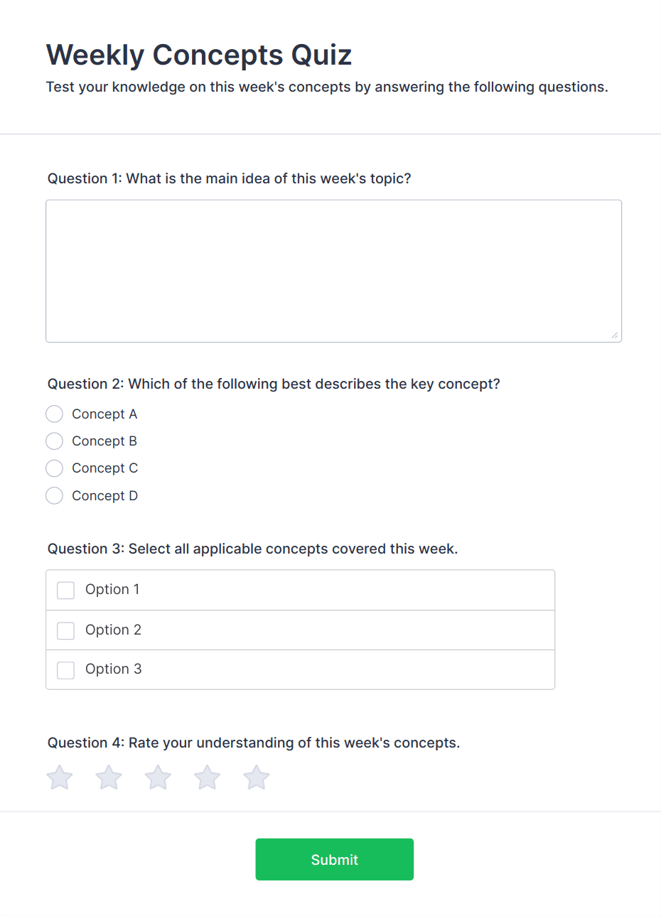 Quiz Templates are pre-designed forms specifically created to facilitate the process of building quizzes for a variety of purposes, such as education, employee training, lead generation, event engagement, and more. These templates provide a structured way to present questions, collect answers, and automatically score or evaluate responses. Whether you’re a teacher assessing student knowledge, a business running a product knowledge test, or a marketer creating a fun personality quiz, Quiz Templates offer a flexible foundation to suit your needs. They can be used for online exams, trivia games, onboarding assessments, customer feedback quizzes, and interactive learning modules.