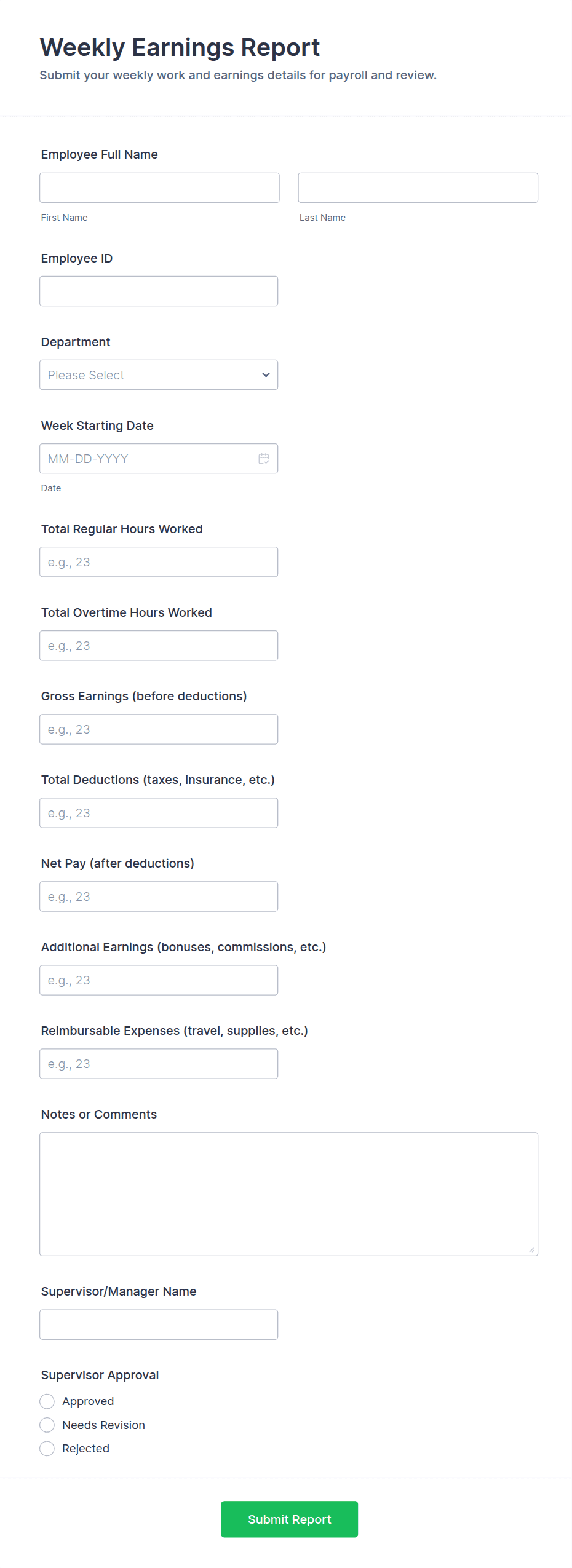 • Financial Reports: Require fields for numerical data, dates, and categories.