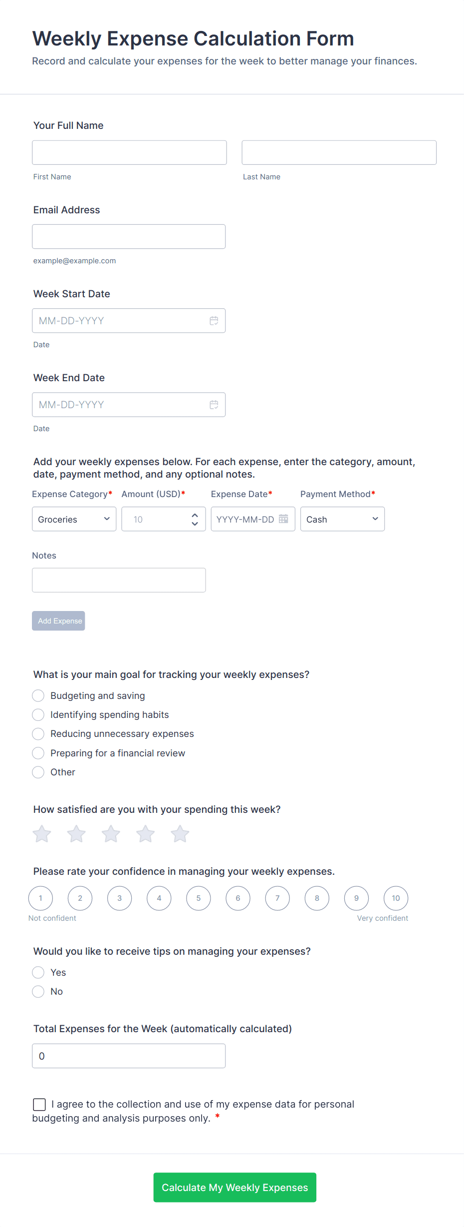 By following these steps, you can create a tailored Expense Tracking Form that streamlines data collection, improves accuracy, and enhances financial oversight for any scenario.