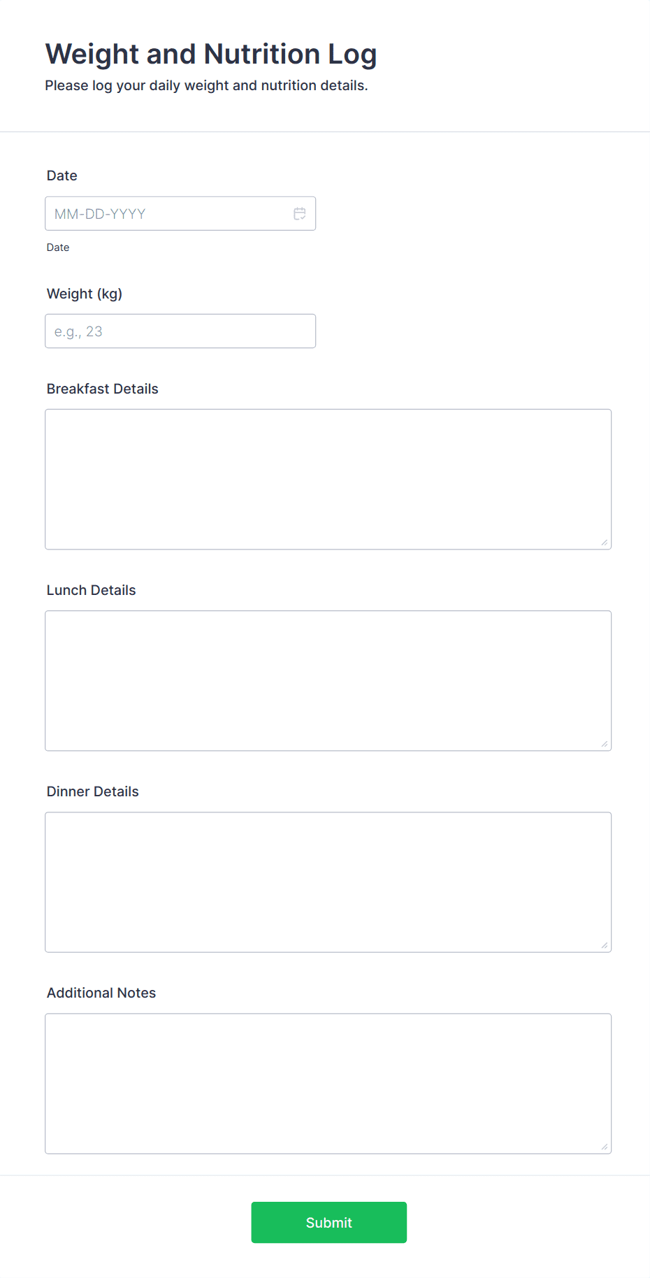 - Nutrition forms could include meal logs, calorie counts, and food groups
