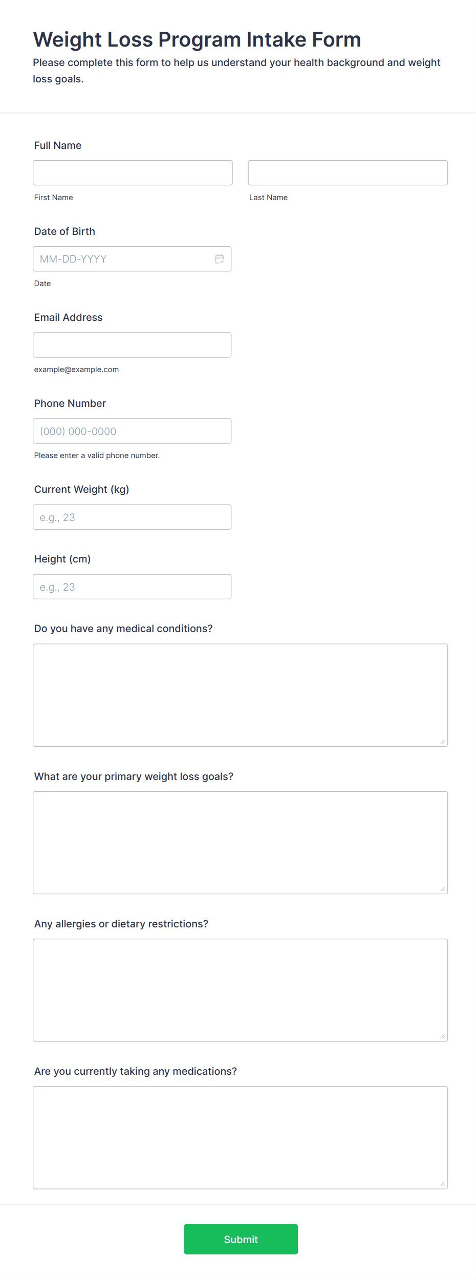 Are you a health coach looking for a convenient way to gather information from your patients? Streamline your intake process with these free Health Coach Forms from Jotform. Choose a form template below to start collecting responses from questionnaires, surveys, and patient health assessments from any device. Customize your forms without any coding with Jotform’s intuitive form builder. Simply drag and drop to add form elements, edit text fields and checklist items, upload your personal branding, and much more. Go paperless and securely collect and store patient data online with a fully-customizable Health Coach Form.