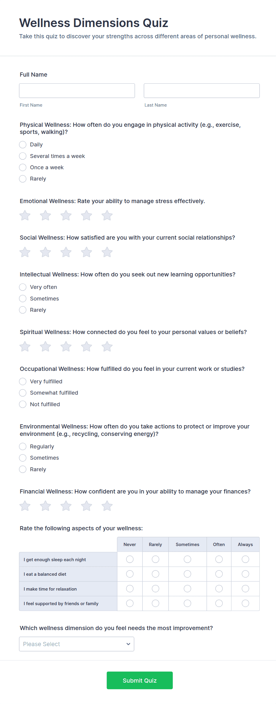 Quiz Templates are pre-designed forms specifically created to facilitate the process of building quizzes for a variety of purposes, such as education, employee training, lead generation, event engagement, and more. These templates provide a structured way to present questions, collect answers, and automatically score or evaluate responses. Whether you’re a teacher assessing student knowledge, a business running a product knowledge test, or a marketer creating a fun personality quiz, Quiz Templates offer a flexible foundation to suit your needs. They can be used for online exams, trivia games, onboarding assessments, customer feedback quizzes, and interactive learning modules.