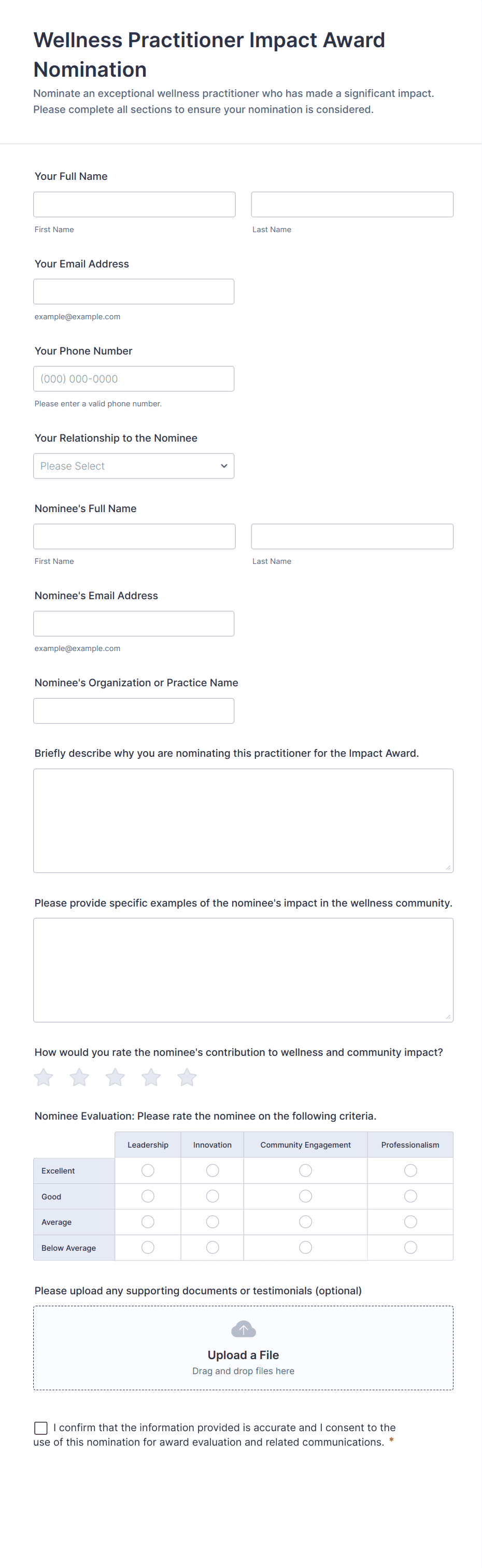 Collect nominee name, role or affiliation, and contact details if needed. Add nominator details and relationship to nominee.