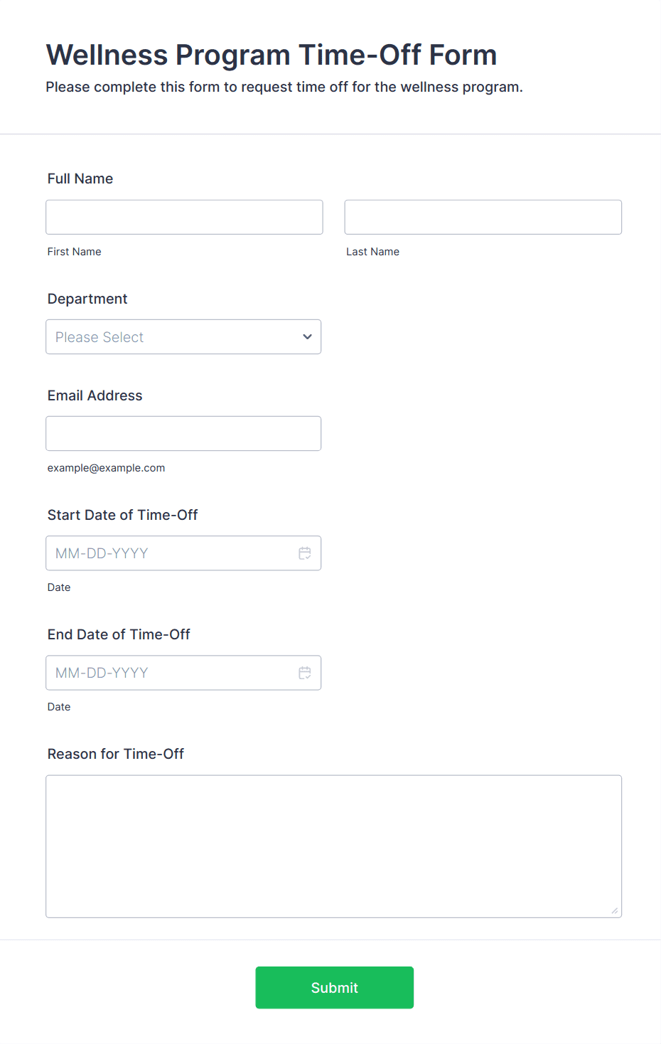 Wellness forms are digital tools designed to collect, track, and manage information related to personal health, well-being, and lifestyle habits. These forms are commonly used by wellness coaches, fitness trainers, healthcare providers, corporate wellness programs, and individuals to monitor aspects such as nutrition, exercise routines, mental health status, sleep patterns, and stress levels. Wellness forms can serve a variety of purposes, including health assessments, daily check-ins, goal tracking, consent collection, and feedback gathering. Their flexibility makes them suitable for use in gyms, clinics, schools, workplaces, and wellness retreats, helping both professionals and individuals stay informed and proactive about health and wellness.