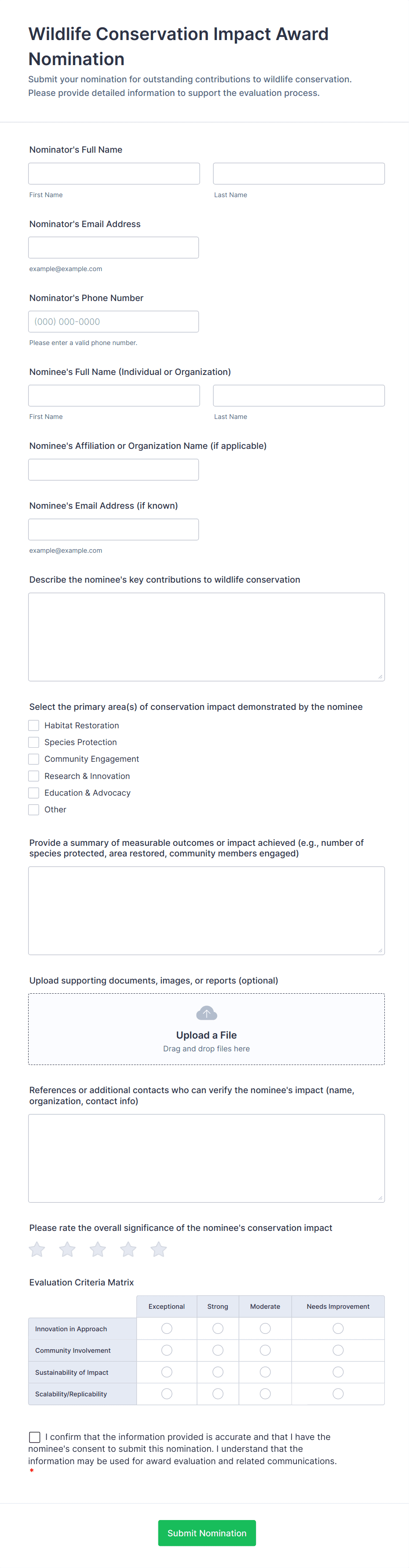 Collect nominee name, role or affiliation, and contact details if needed. Add nominator details and relationship to nominee.