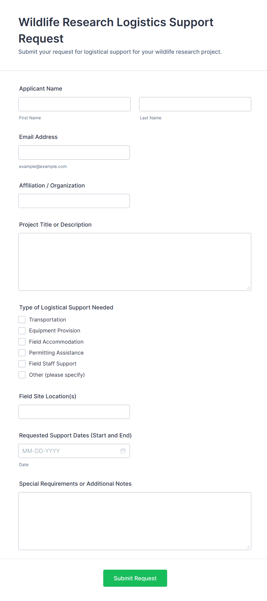 • Content and Fields: The fields included in the form will differ based on the use case. For example, a customer inquiry form may require contact details and a description of the issue, while a research data request form might need institutional affiliation and project details.