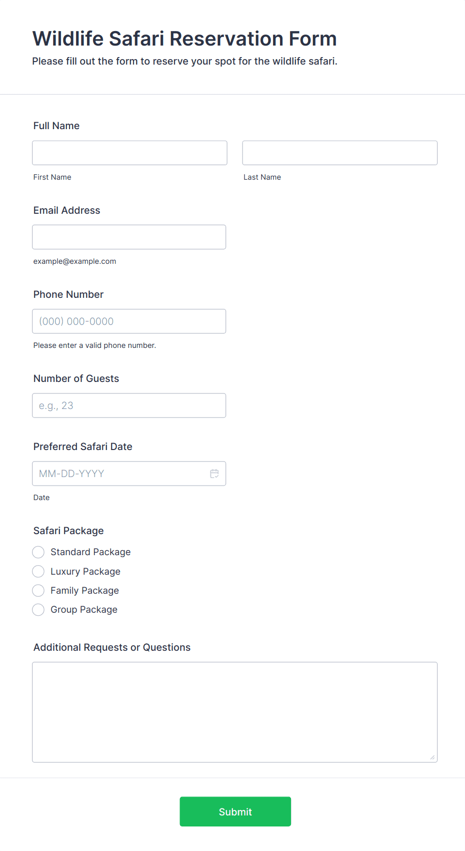 A simple form template which allows customers to submit their booking inquiry or any other comment with their contact information that would allow you to conveniently respond your customers to confirm the booking availability.
