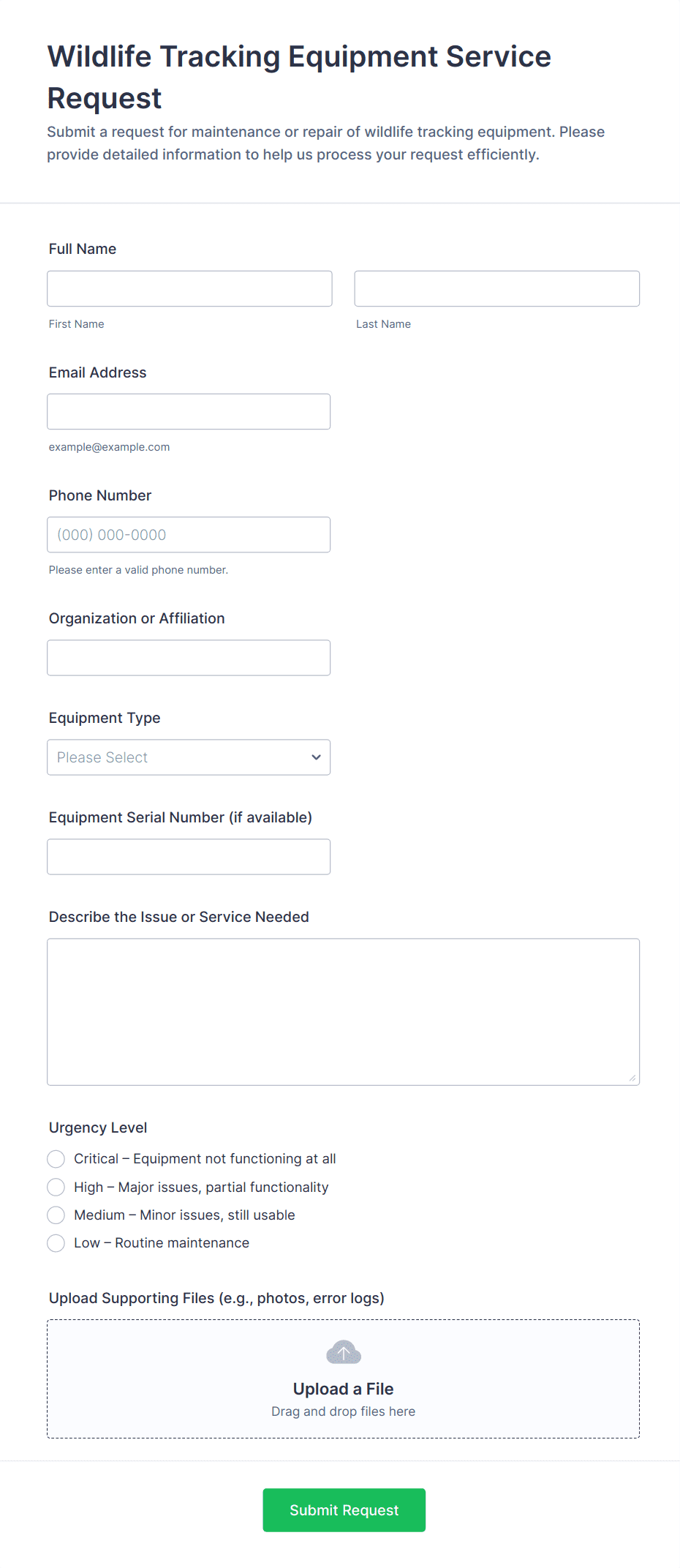 Wildlife Tracking Equipment Service Request Form helps researchers and conservation teams report issues, upload evidence, and prioritize maintenance for tracking devices in a single online request workflow.