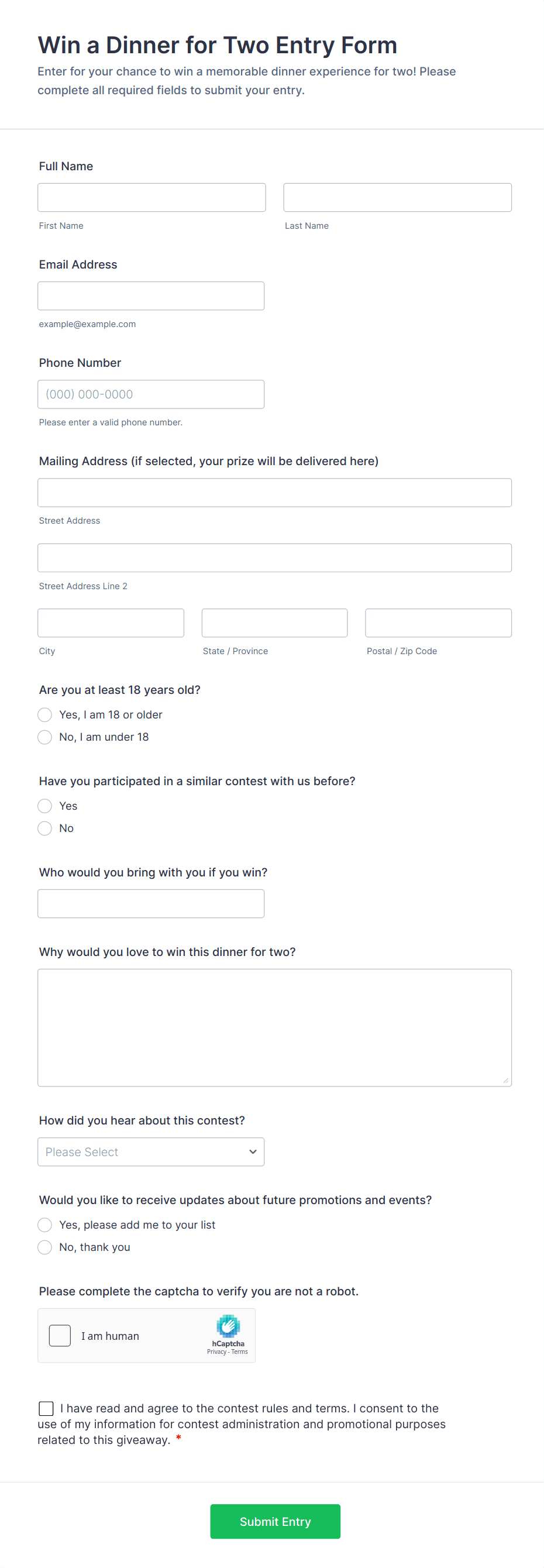 Contest entry forms are specialized online forms designed to collect participant information for a wide range of competitions, giveaways, and sweepstakes. These forms streamline the process of gathering essential details such as names, contact information, eligibility confirmations, and contest-specific responses like creative submissions or answers to quiz questions. Whether you’re running a photo contest, a writing competition, a social media giveaway, or a corporate challenge, contest entry forms help organizers efficiently manage entries, ensure compliance with rules, and maintain a fair and organized selection process.