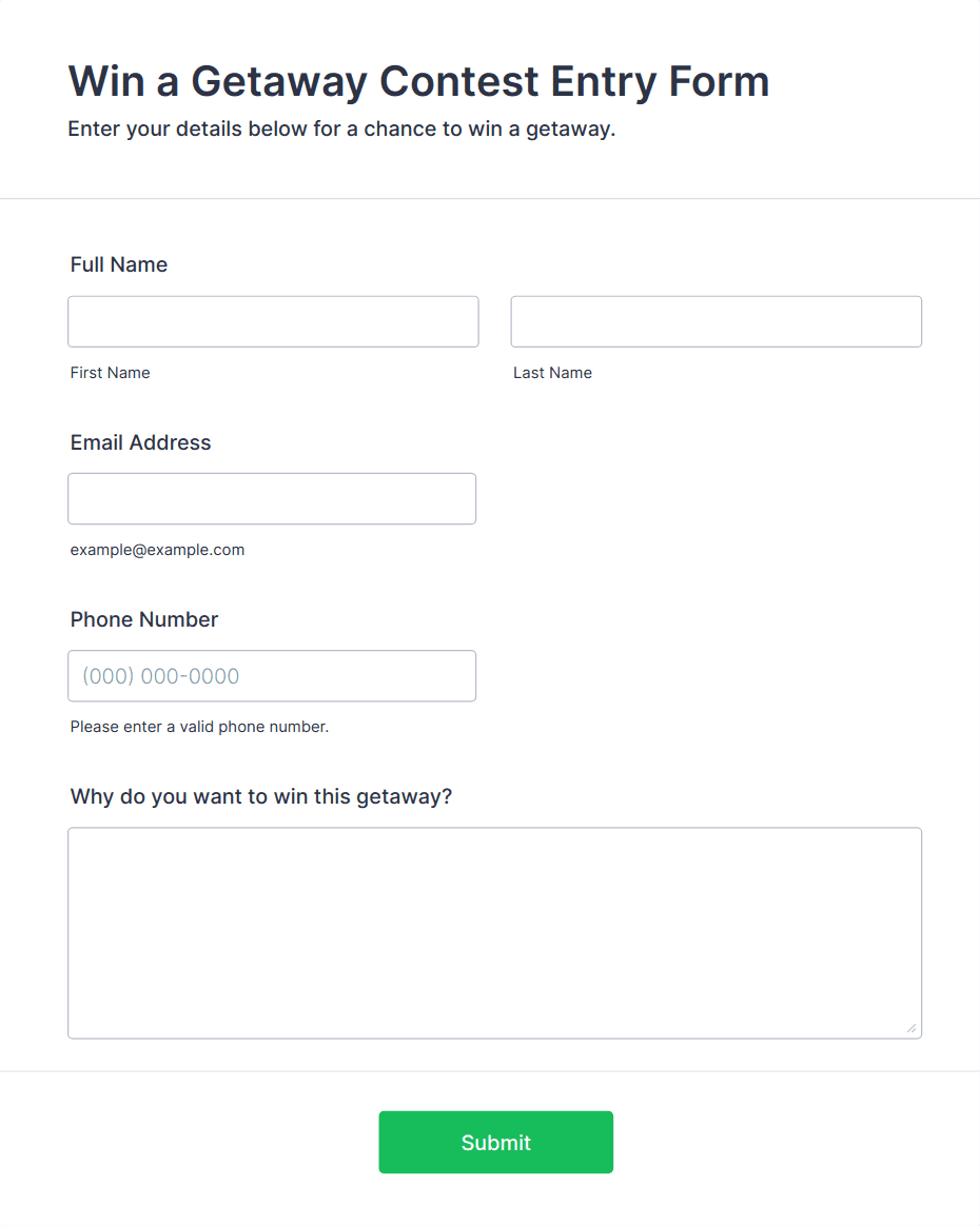 Contest entry forms are specialized online forms designed to collect participant information for a wide range of competitions, giveaways, and sweepstakes. These forms streamline the process of gathering essential details such as names, contact information, eligibility confirmations, and contest-specific responses like creative submissions or answers to quiz questions. Whether you’re running a photo contest, a writing competition, a social media giveaway, or a corporate challenge, contest entry forms help organizers efficiently manage entries, ensure compliance with rules, and maintain a fair and organized selection process.