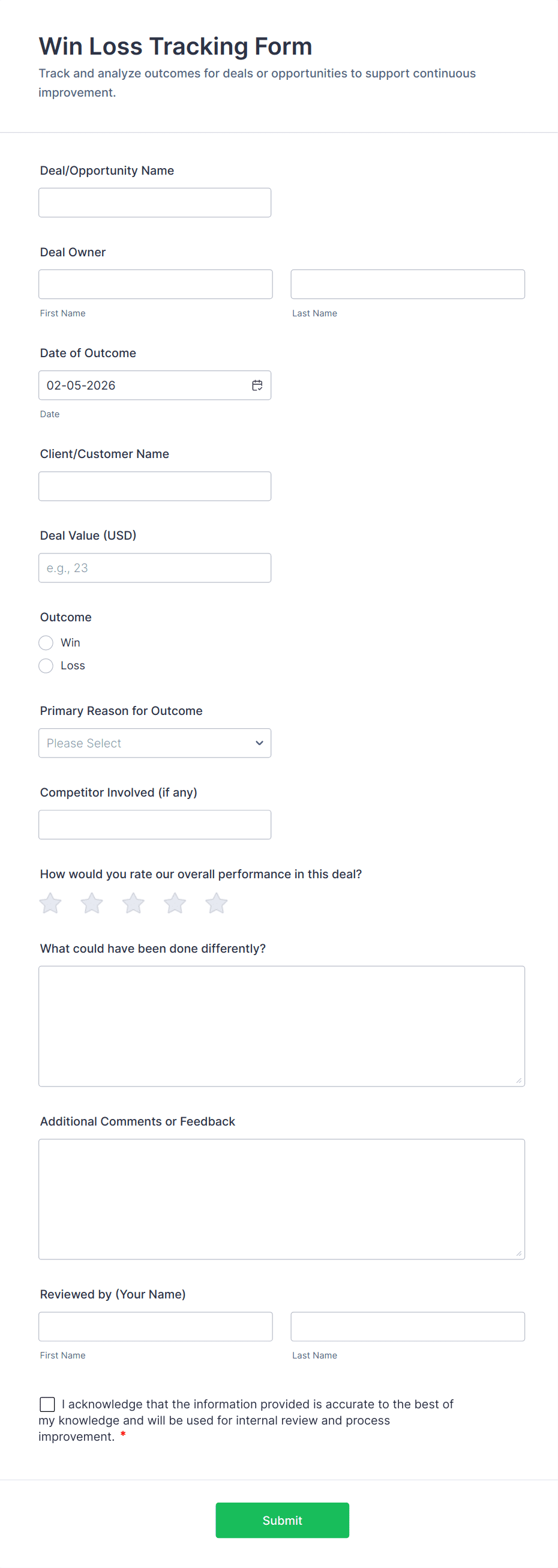 A tracking form is a digital tool used to record, monitor, and manage specific types of data over time, such as inventory levels, attendance, expenses, or project progress.
