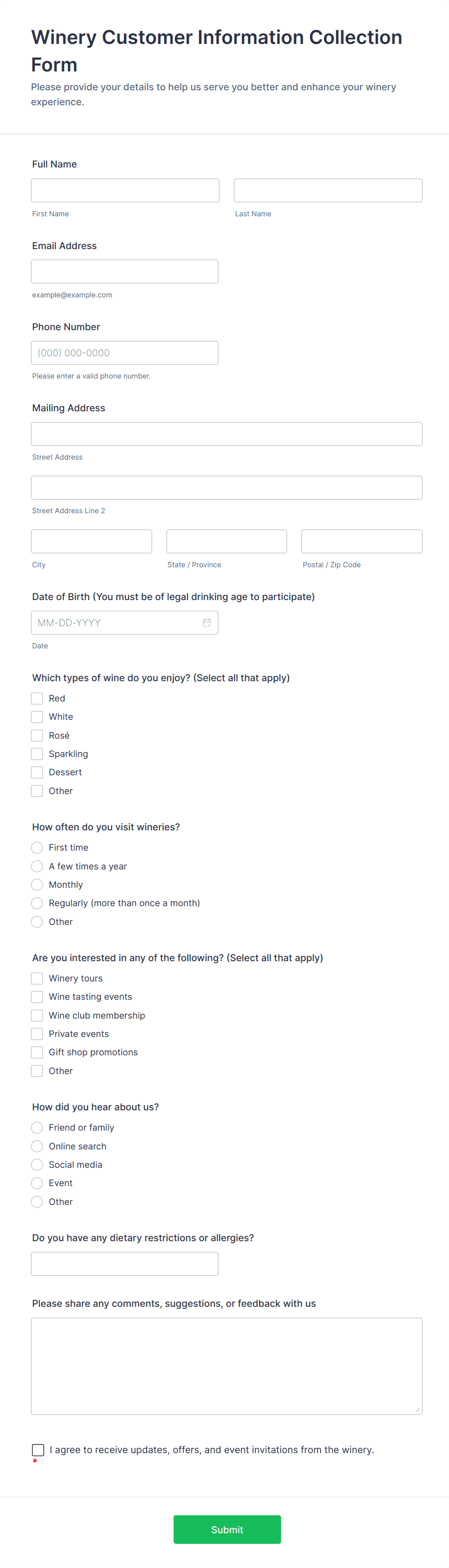 - Loyalty program enrollment: Typically requests contact details and consent for marketing communications.
