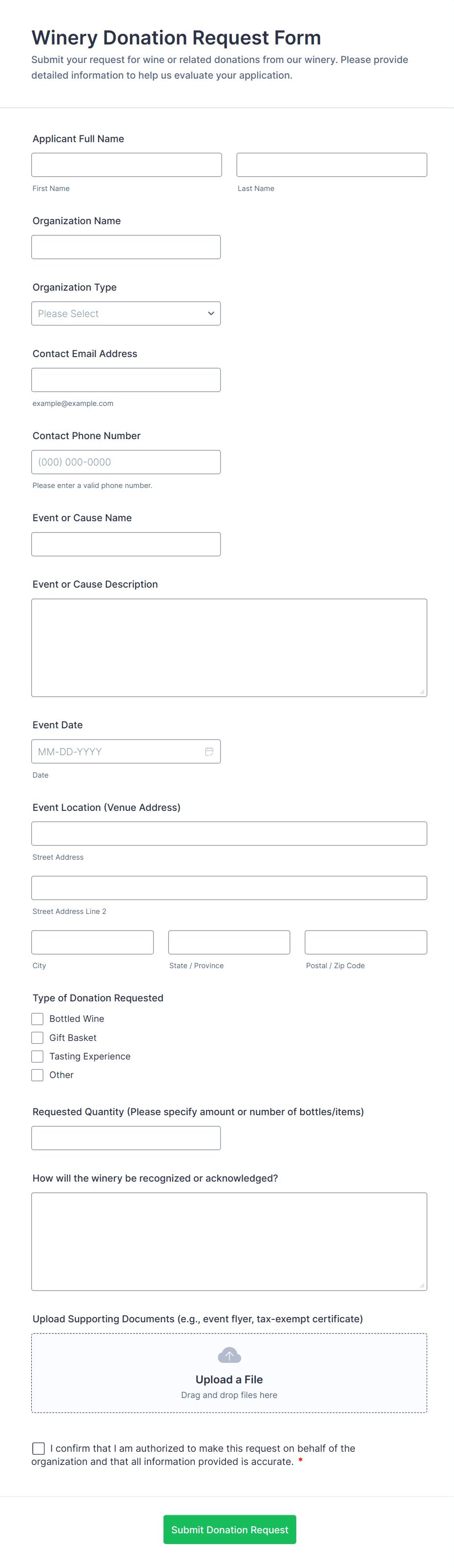 Donation forms are specialized online forms designed to collect contributions for charitable organizations, fundraising campaigns, nonprofit initiatives, and community projects. These forms streamline the process of gathering donor information, processing payments, and tracking contributions, making it easier for organizations to raise funds efficiently. Donation forms can be used for a variety of purposes, such as one-time or recurring donations, event sponsorships, crowdfunding efforts, membership drives, and emergency relief campaigns. They are essential tools for nonprofits, schools, religious groups, and community organizations seeking to engage supporters and facilitate secure, convenient giving.