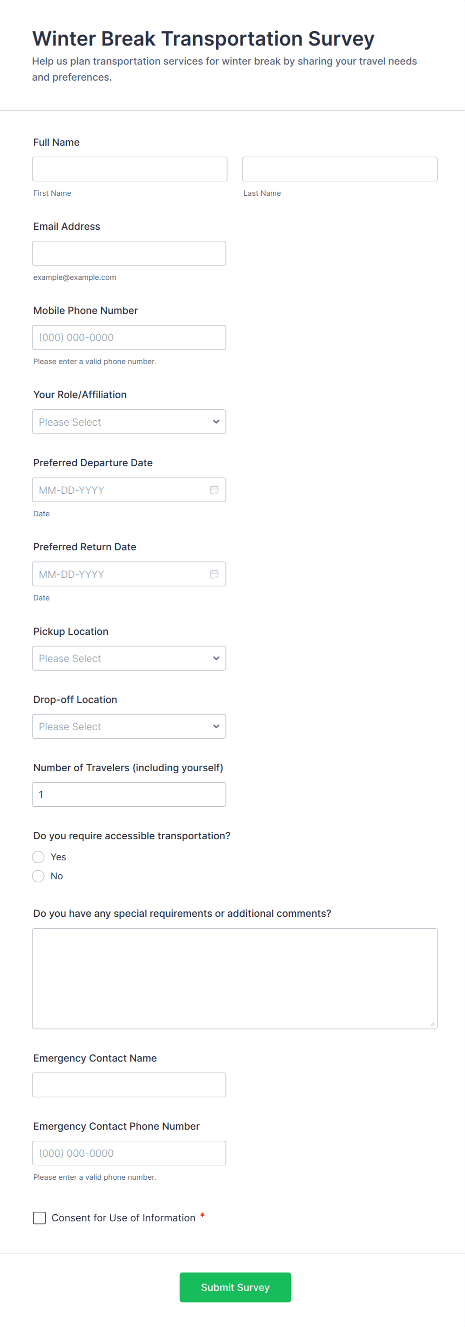 Transportation Request Forms are digital documents designed to streamline the process of requesting, scheduling, and managing transportation services. These forms are commonly used by organizations, schools, event planners, logistics companies, and individuals to coordinate vehicle usage, arrange pickups and drop-offs, or request special transport accommodations. Typical use cases include employee shuttle requests, student field trip transportation, medical transport scheduling, delivery service coordination, and event guest transfers. By centralizing transportation requests, these forms help ensure that all necessary details—such as passenger information, pickup and drop-off locations, dates, times, and special requirements—are accurately captured and communicated.