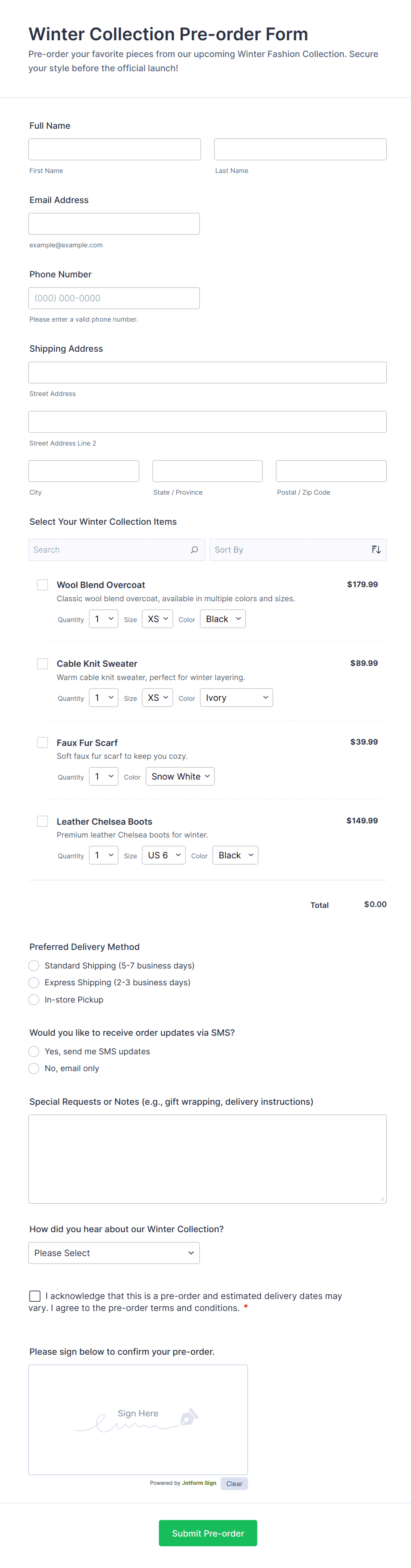 Embed a free Pre-Order Form Template in your store’s website to instantly process product pre-orders online. Free to use, easy to customize!