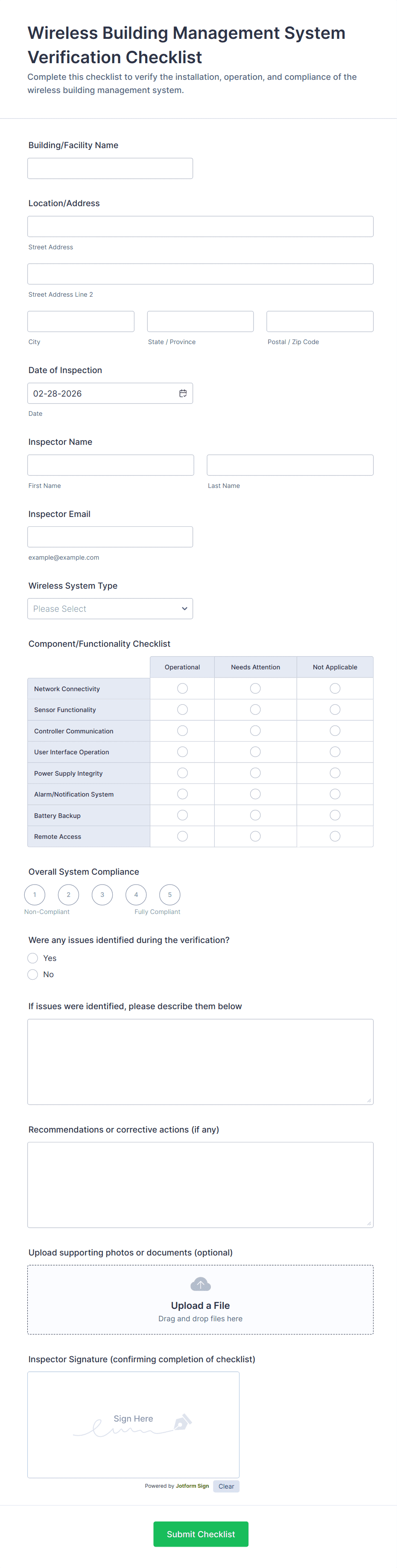 The Framing Inspection Checklist from Jotform helps inspectors and contractors standardize data collection, document issues on site, and manage form submissions easily using the Jotform Form Builder and its drag-and-drop interface.