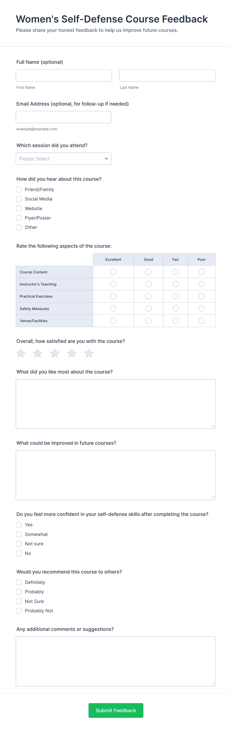 - Workshop feedback forms might focus on session relevance, hands-on activities, and logistics.