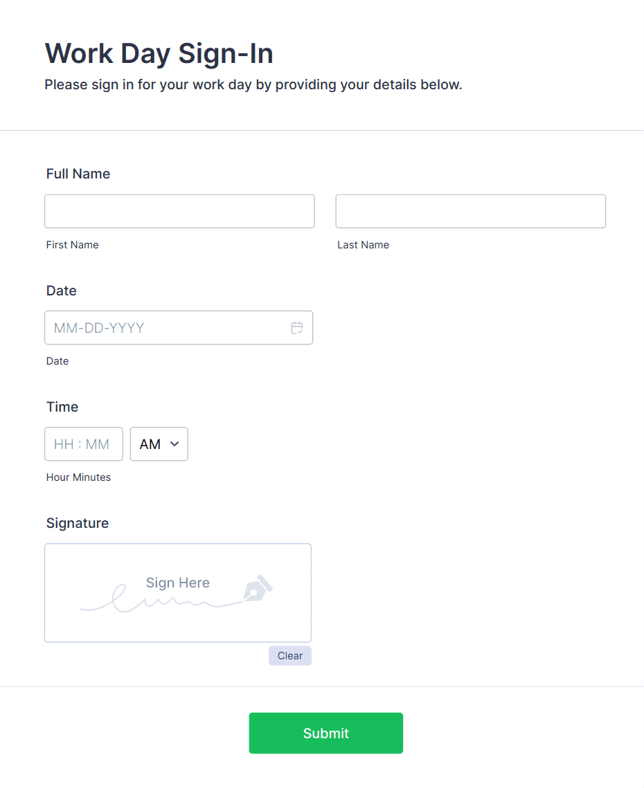 - Corporate Forms: Might require employee ID, department, check-in/out times, and approval signatures.