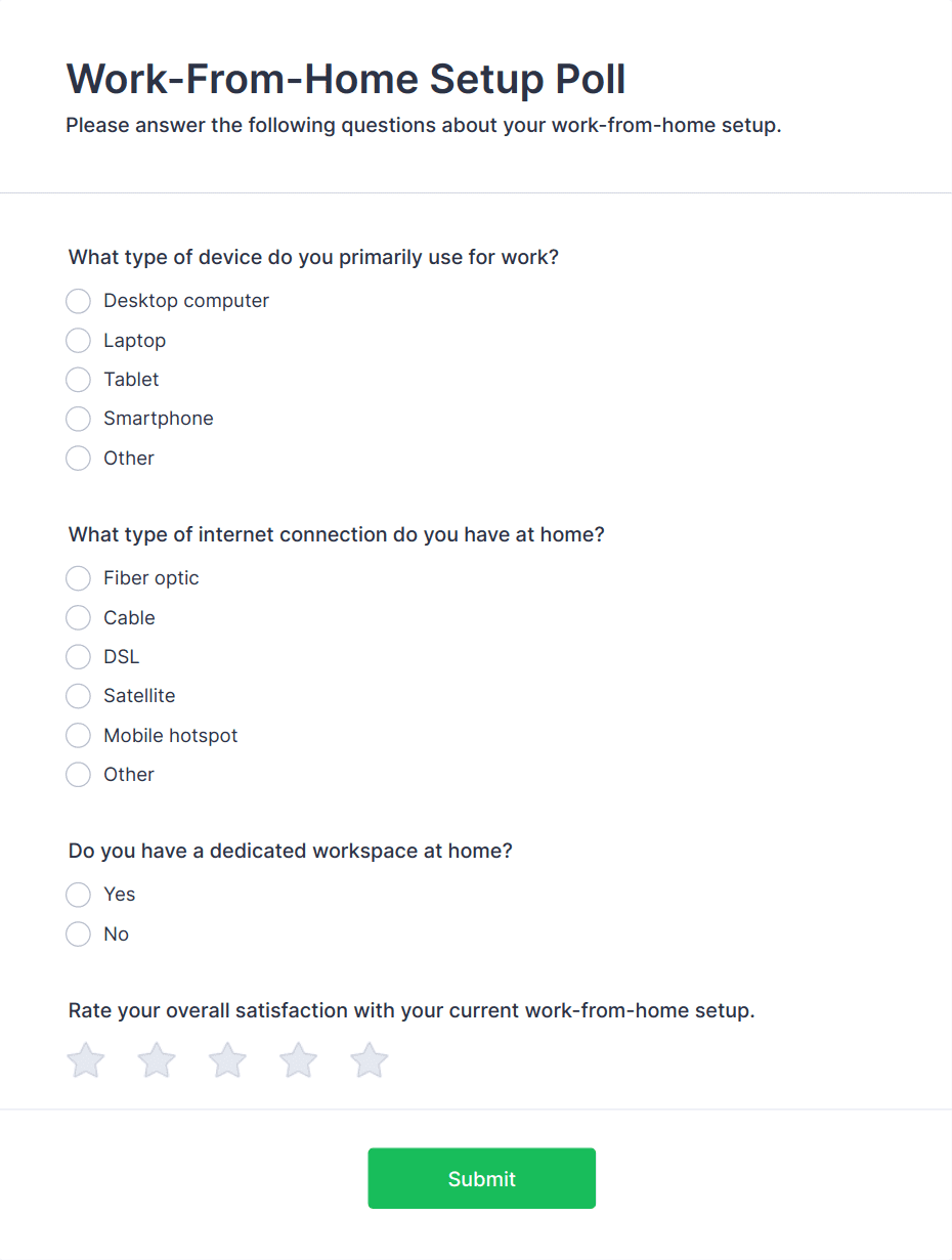 Analyze your current work from home policy with a free online Remote Work Survey. Ideal for coronavirus-related remote workplaces. Sync responses to 100+ apps.