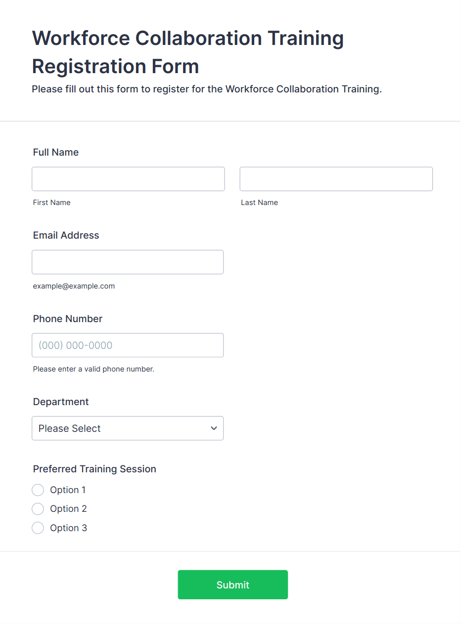 A Training Registration Form is a user-friendly form template designed to streamline the registration process for training providers, corporate HR teams, nonprofits, and event management teams.
