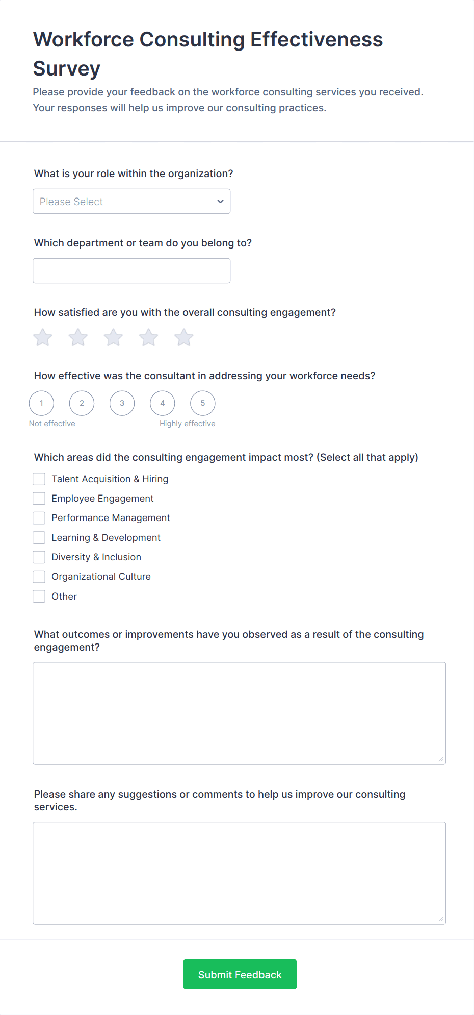 Employee Survey Templates are pre-designed forms that organizations use to gather feedback, opinions, and insights from their workforce. These templates cover a wide range of topics, including job satisfaction, workplace culture, employee engagement, training needs, performance evaluations, and more. By using employee survey templates, HR professionals, managers, and business owners can efficiently collect valuable data to understand employee sentiment, identify areas for improvement, and make informed decisions that enhance workplace productivity and morale. Common use cases include onboarding feedback, exit interviews, pulse surveys, annual engagement surveys, and 360-degree feedback.