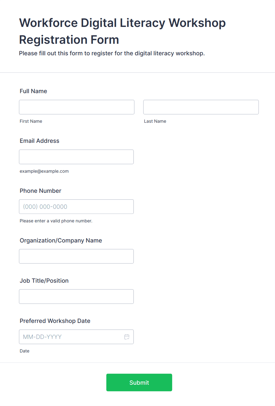 • Workshops and training sessions: Register participants, gather skill levels, and manage waitlists.