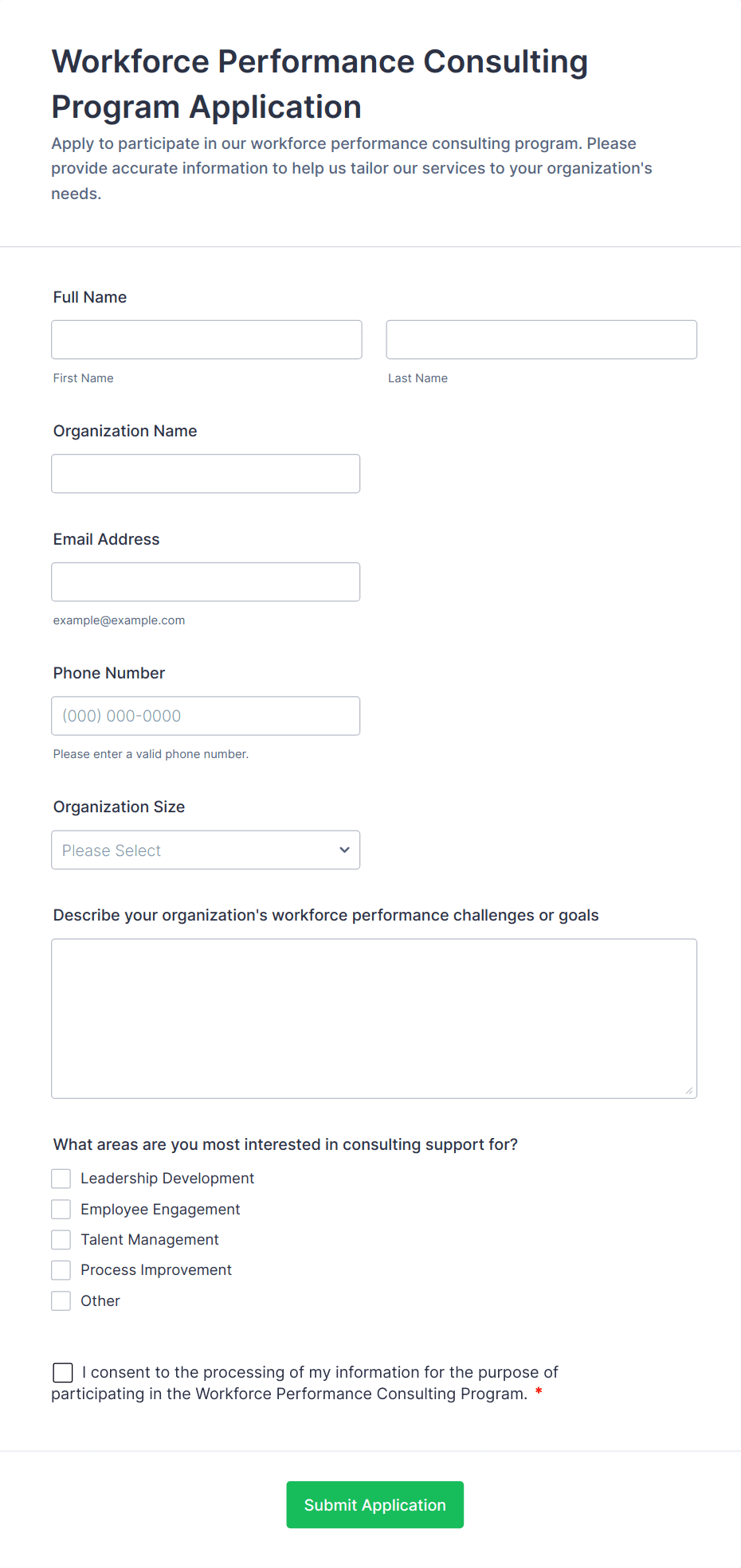 Consulting forms are specialized digital documents designed to streamline the information-gathering and communication processes between consultants and their clients. These forms can be used for a variety of purposes, such as client intake, needs assessments, project proposals, feedback collection, appointment scheduling, and progress tracking. Consulting forms help consultants efficiently collect essential details, clarify project scopes, set expectations, and document agreements, making them invaluable tools for independent consultants, consulting firms, and agencies across industries like business, IT, HR, marketing, and more.