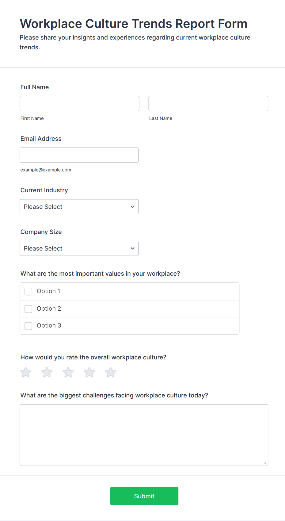 • For onboarding or exit surveys, add fields about the hiring process, training, or reasons for leaving.