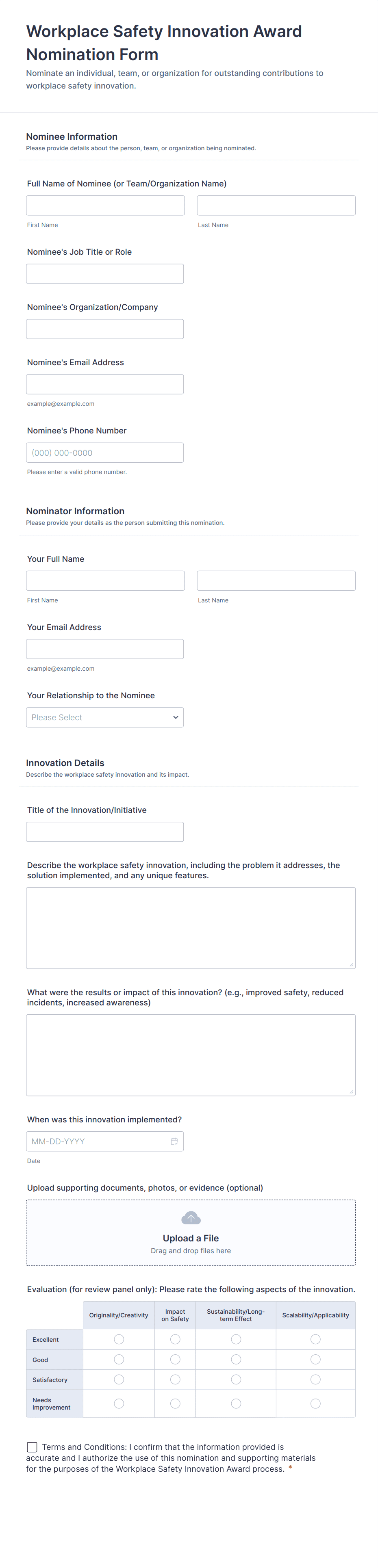 - Open nomination and public submission forms prioritize simple entry flow, category selection, supporting attachments, and reviewer-ready summaries that reduce follow-up.