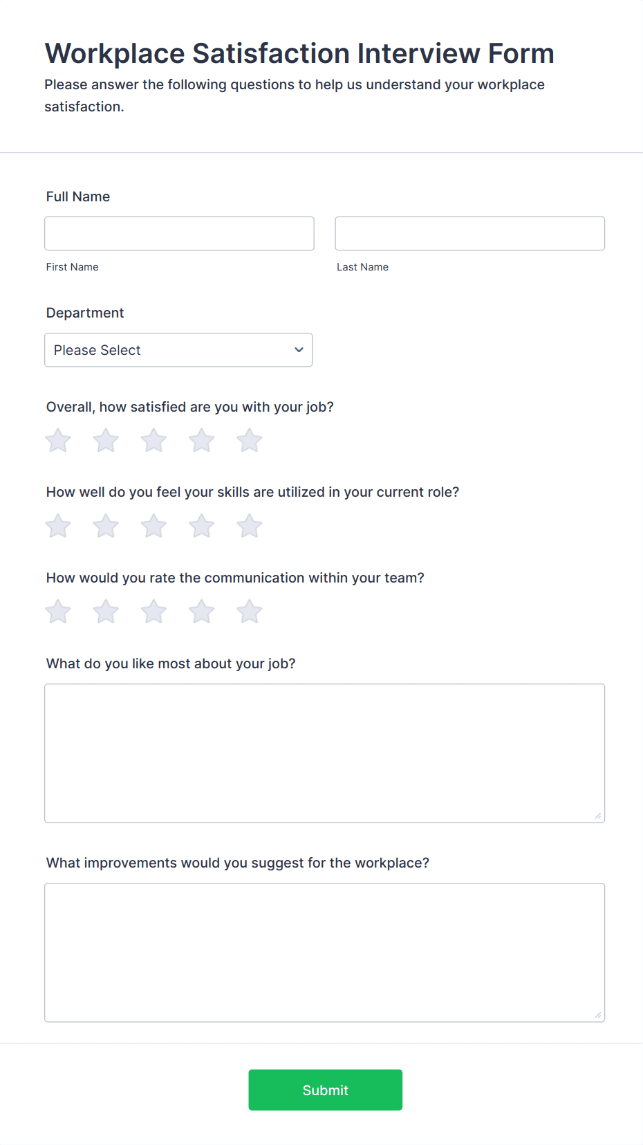 The Work Satisfaction Survey is a very important and useful form for your workplace that allows you to understand how satisfied employees are with their jobs, their pay and benefits, and the people they work with. No code required either!