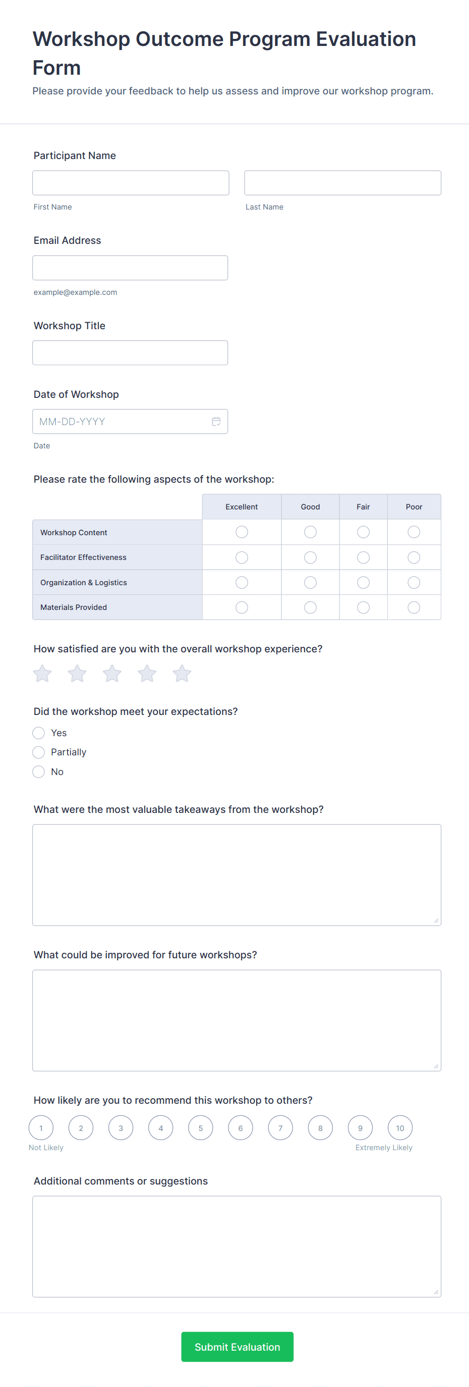 Collect consistent post-training feedback with the Corporate Workshop Effectiveness Questionnaire Form, ideal for HR, L&D teams, and facilitators who want clearer data collection and easier review of every form submission.