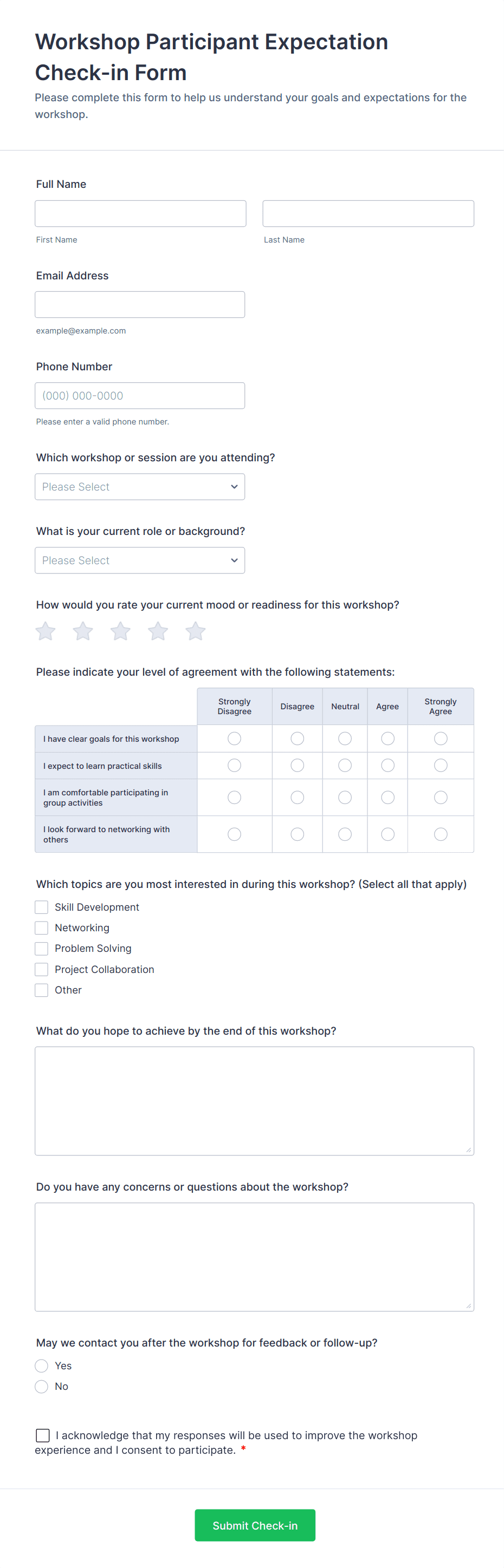 - Basic Fields: Name, email, phone number, date and time of check-in.