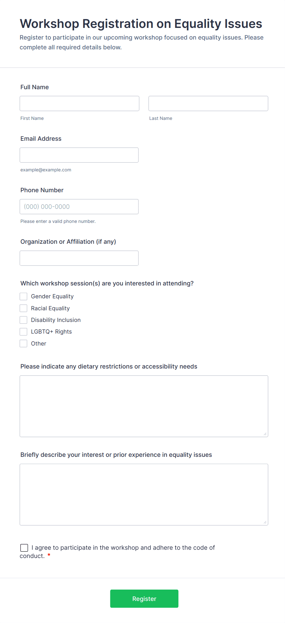3. What information should be included in a workshop registration form?