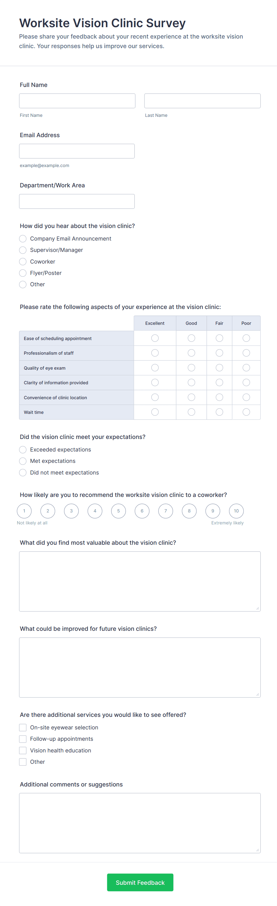 • Health-specific fields: Multiple choice for symptoms, rating scales for satisfaction, long text for open feedback.