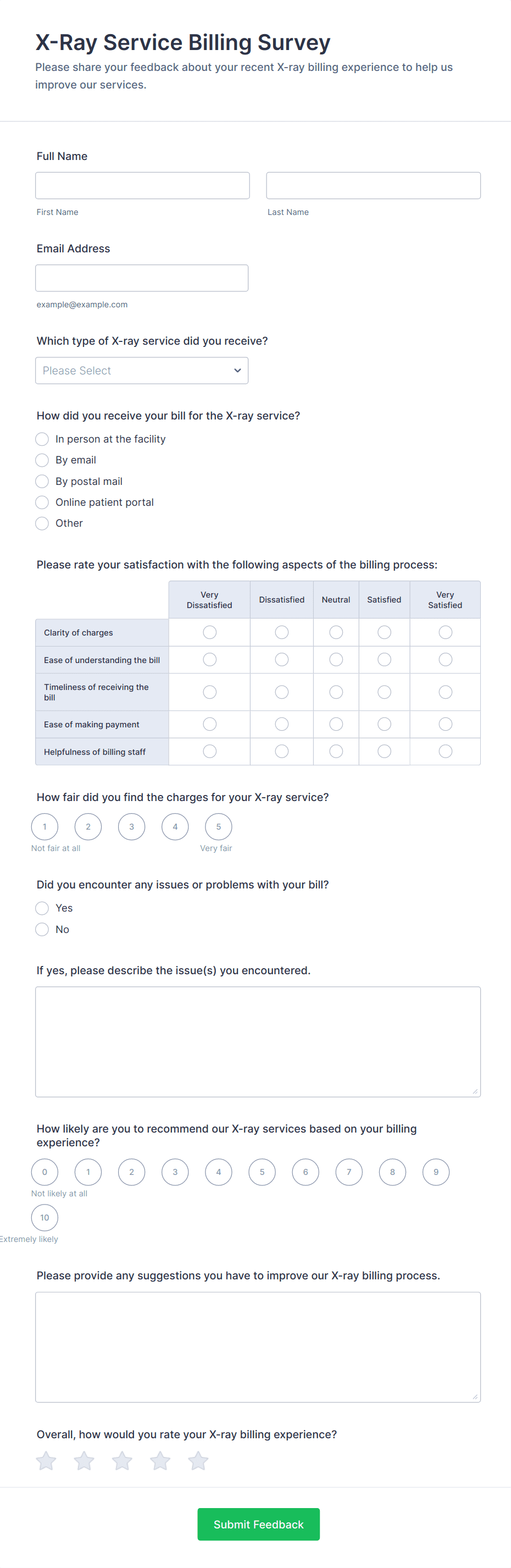 • Health-specific fields: Multiple choice for symptoms, rating scales for satisfaction, long text for open feedback.