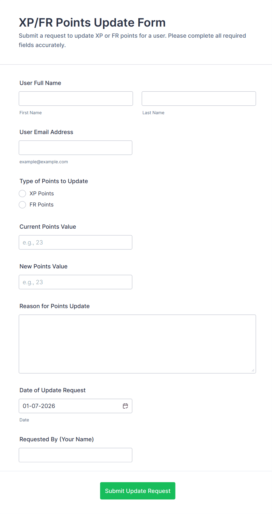 The XP/FR Points Update Form is used to request and document changes to a user’s XP, FR, or similar points in your system so that adjustments are consistent, traceable, and easy to review.