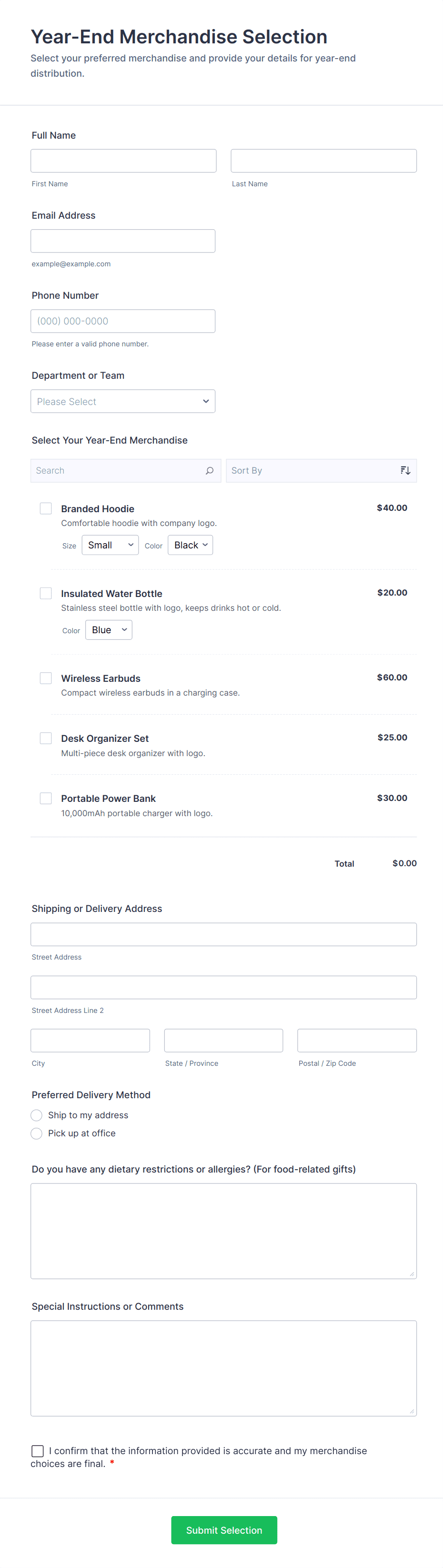 Collect employee year-end gift selections, delivery preferences, and confirmation in one place with the Year-End Merchandise Selection Form, ideal for HR teams and office managers coordinating company-wide appreciation programs.