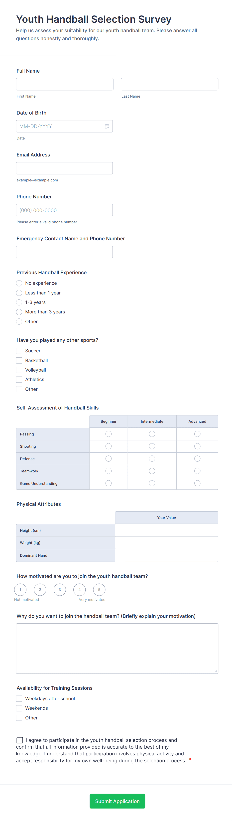 Sports form templates are suitable for league administrators, coaches, event organizers, school athletic departments, fitness instructors, and volunteers.