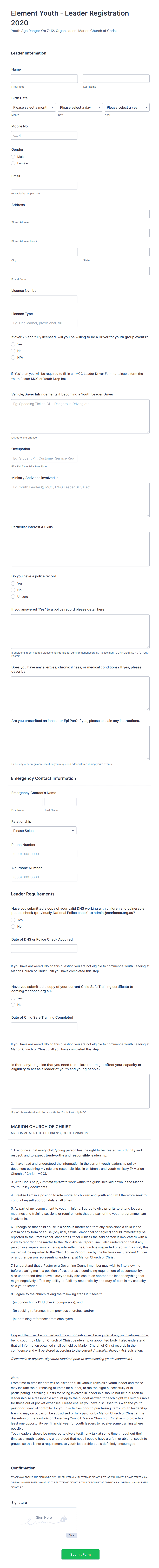 Churches use online forms for new member registration, donations, event and meeting planning, and scheduling visits to your place or worship. Browse one of our online church form templates that will help you gather information of any member, manage volunteer applications, and collect member information and donations easily. Every one of these church form templates are fully customizable and easy to edit.