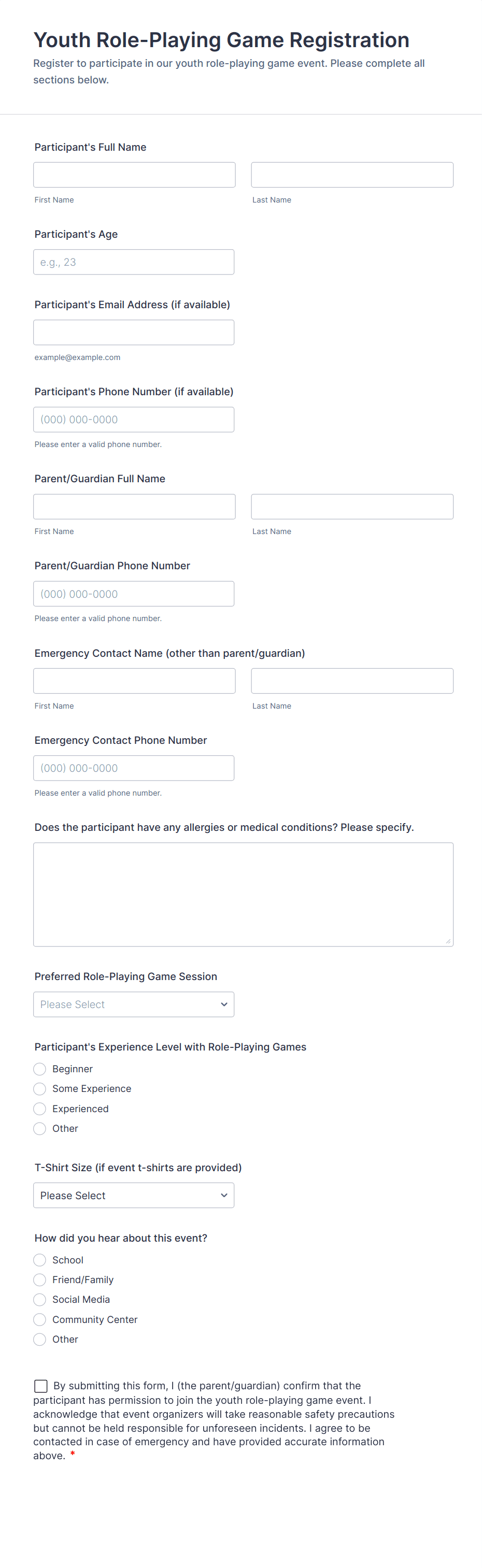 A Role Play Application Form is a form template that simplifies role selection and approval for gaming or educational purposes. It eases the process by eliminating physical paperwork, providing a clear, intuitive interface. Improve your role-play experiences with Jotform's digital solution.