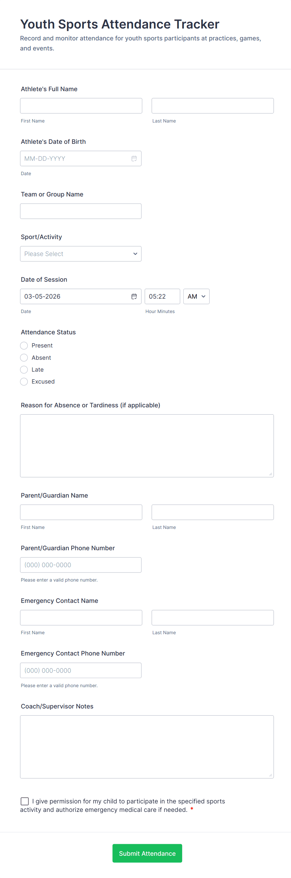 - Custom Fields: Student/employee ID, department/class, reason for absence, or session selection.